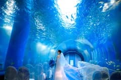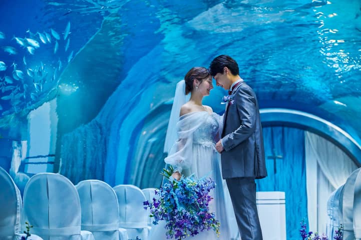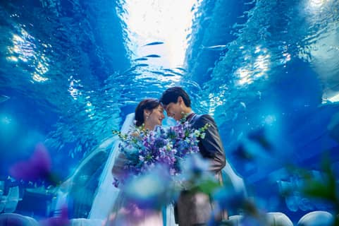 水族館を貸し切り、海中トンネルに椅子を並べてバージンロードに。見上げれば水面にはキラキラと差し込む光、バージンロードにはゆらめく波の模様が。挙式後は水族館での写真撮影も。