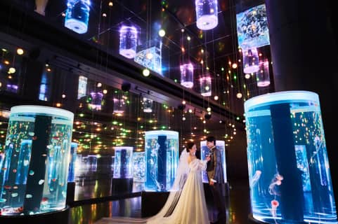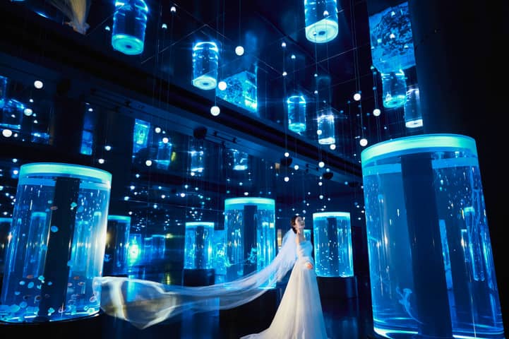 水族館での前撮り撮影は、ほかでは撮れない幻想的で神秘的なシーンを創りあげます。