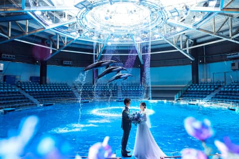 イルカや魚たちと映る幻想的な写真は、はじまりの日を彩る記念の一枚にぴったりです。