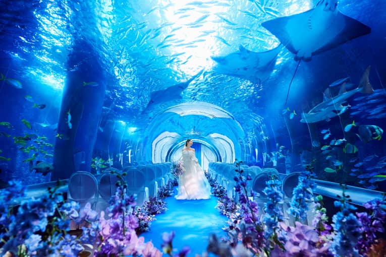 水族館を貸し切り、海中トンネルに椅子を並べてバージンロードに。見上げれば水面にはキラキラと差し込む光、バージンロードにはゆらめく波の模様が。挙式後は水族館での写真撮影も。