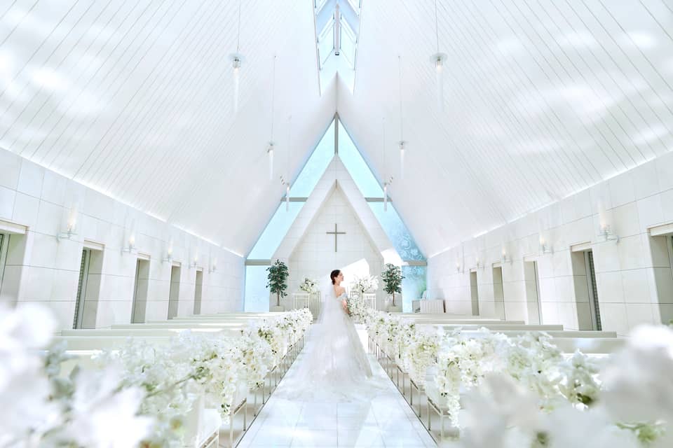 天窓から光差し込む白亜のチャペル